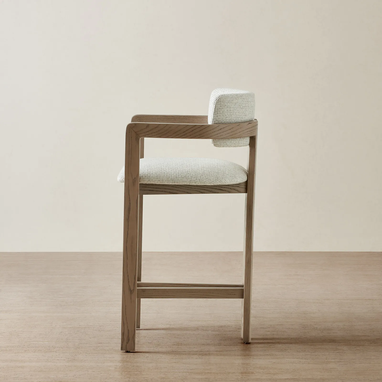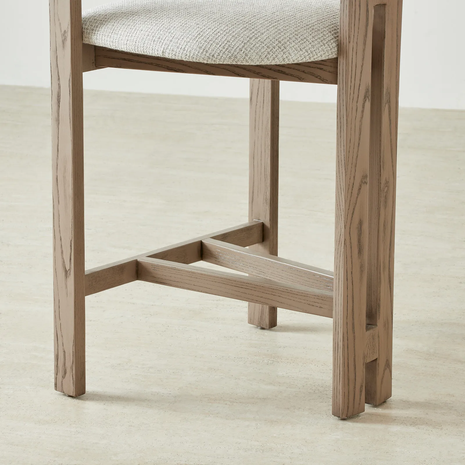 Clean lines and quiet comfort define the Desmond Counter Stool. Upholstered in dove grey fabric, its seat and backrest offer a soft, supportive place to sit.