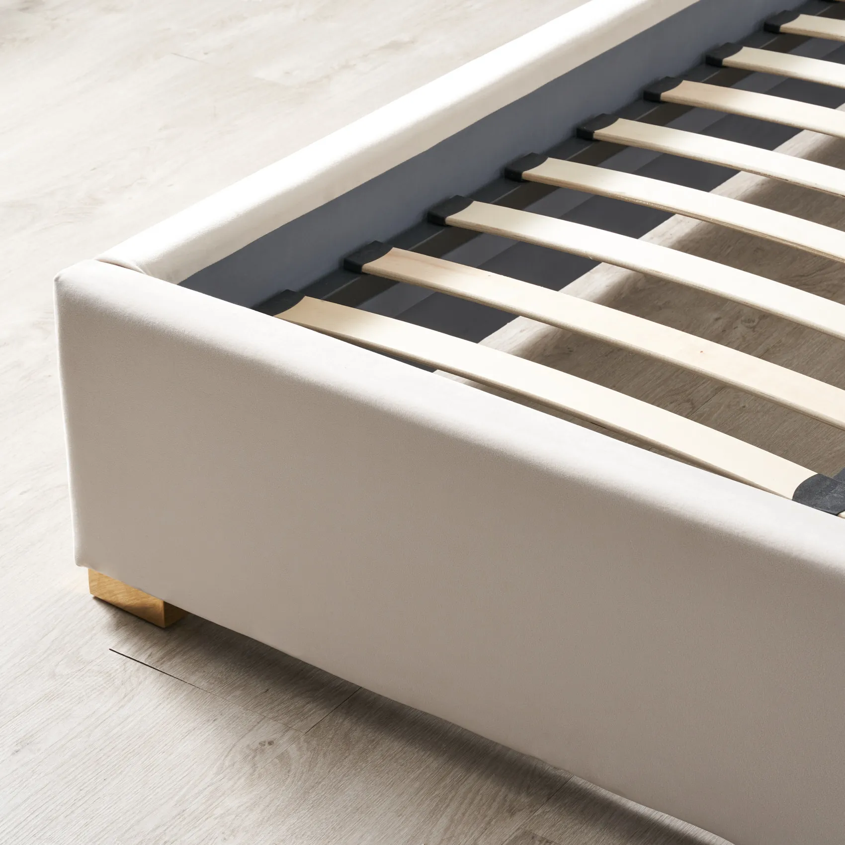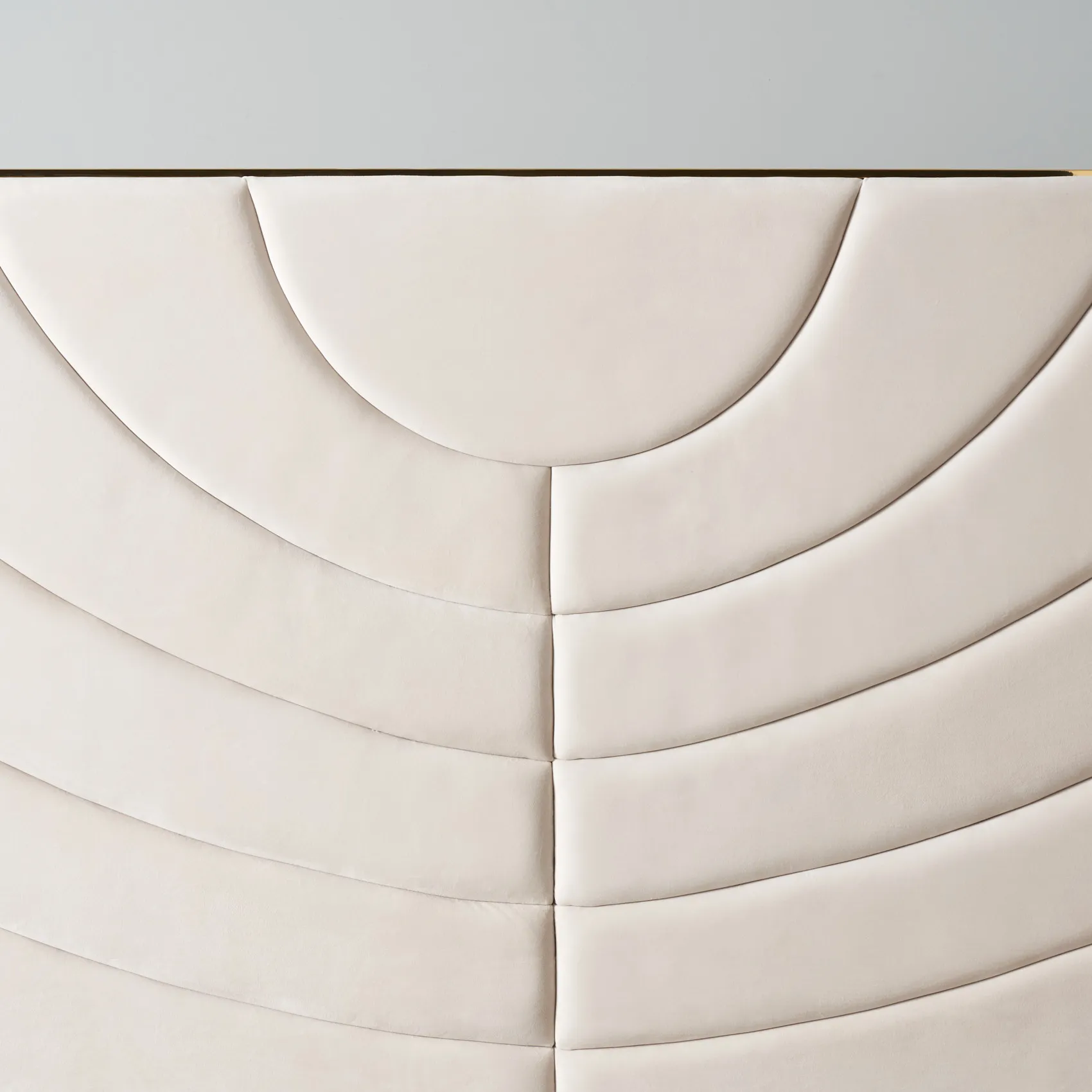 The Gertrude possesses’ qualities that will elevate your bedroom’s style to heavenly heights. This majestic piece is made from high-quality materials and features a luxurious white and gold colour scheme that fits modern or minimalistic themes. The Velvet headboard is artistically designed with elegant curves and lines reminiscent of beautiful sand art. Supporting each side of the bed are two golden frames giving the piece a chic and luxurious aesthetic. This combination of stylish design and gorgeous colours makes the Gertrude an undeniable focal point for your bedroom.