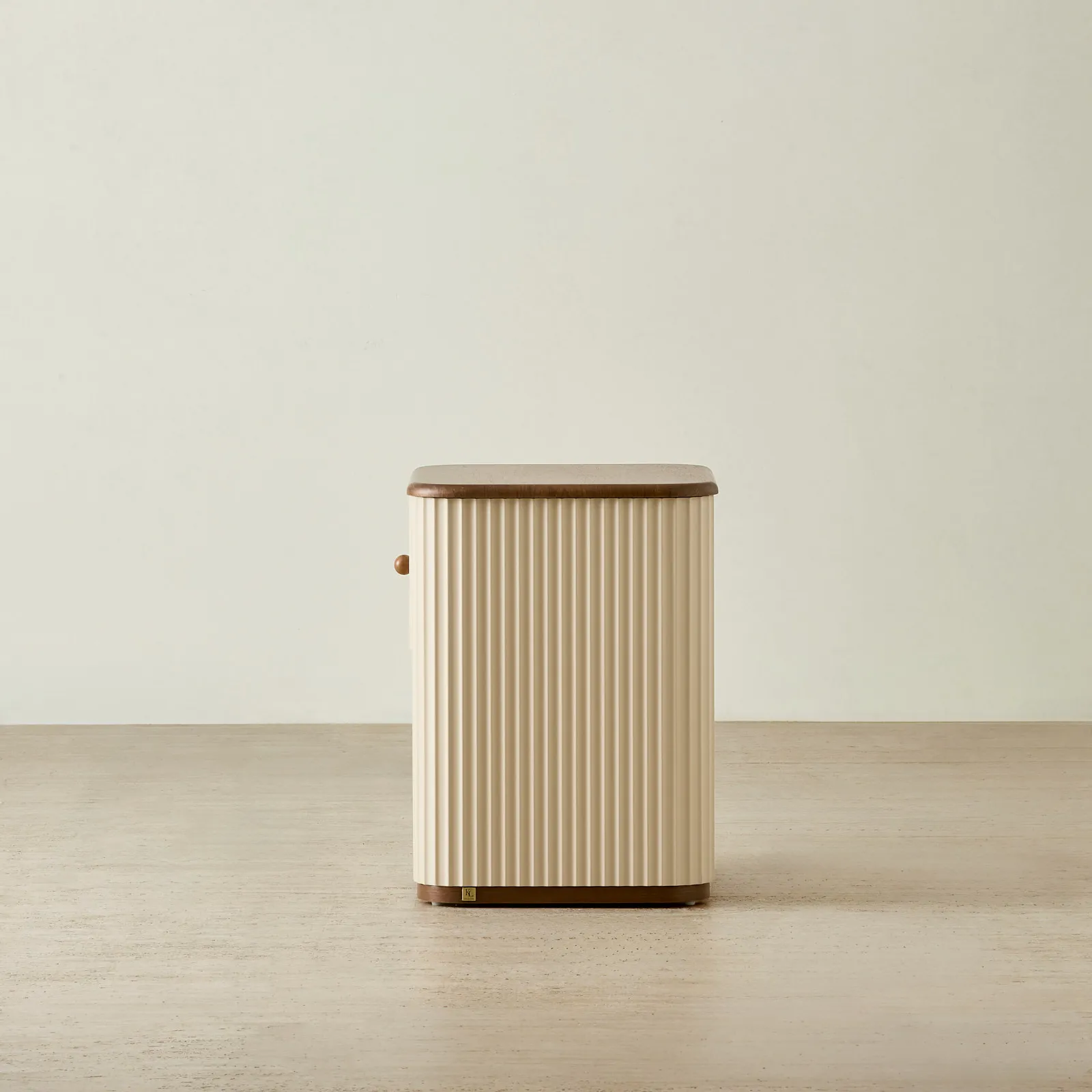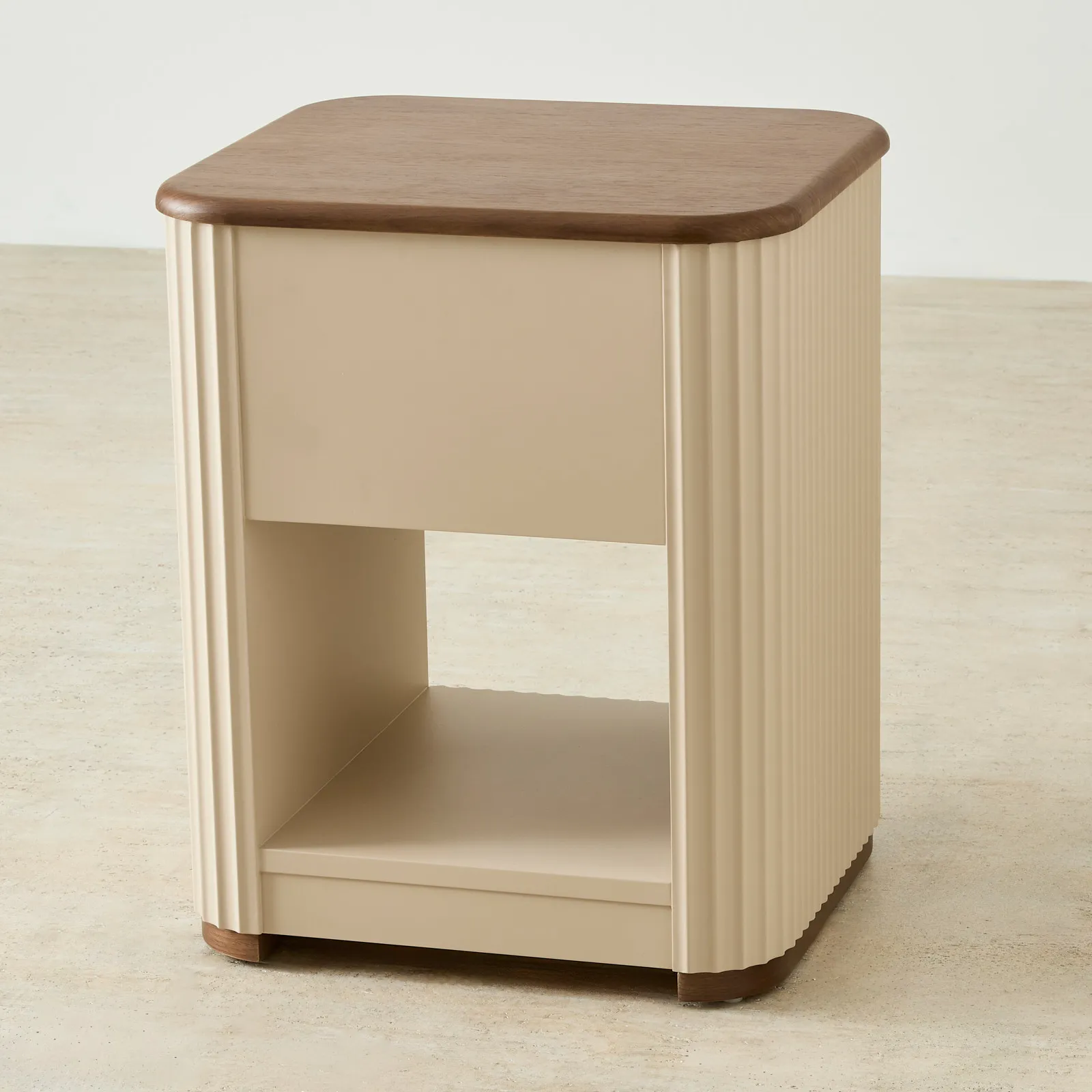 A single drawer with a simple knob holds favorites, while the open shelf below is ready for books, toys, or slippers. Ribbed sides add a playful touch to this sturdy piece made just for little rooms.