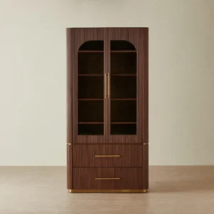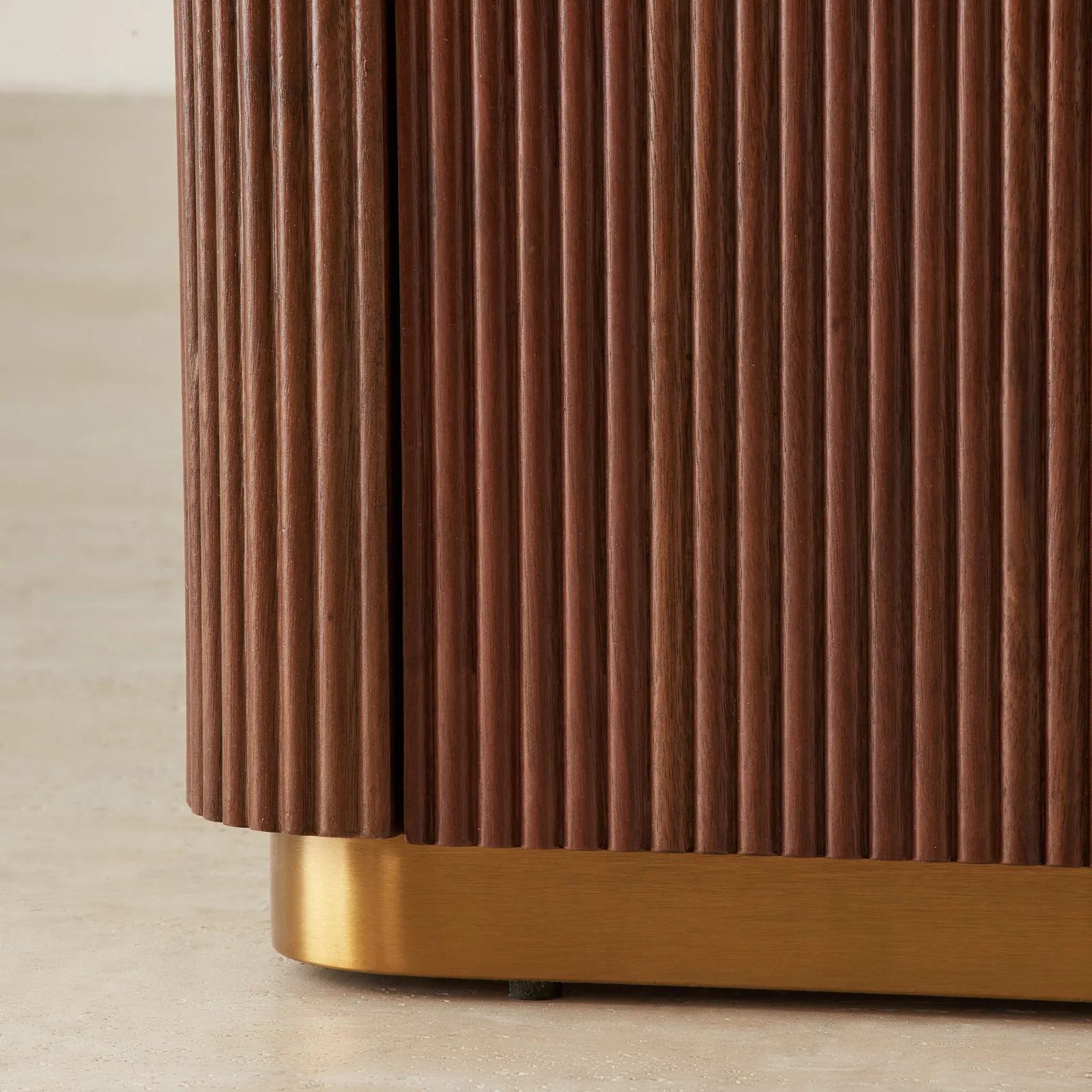 Vertical reeding adds rhythm to the design, giving the wood a rich, sculpted presence. Below, two deep drawers with brass handles provide a sleek, hidden space for everyday essentials.
