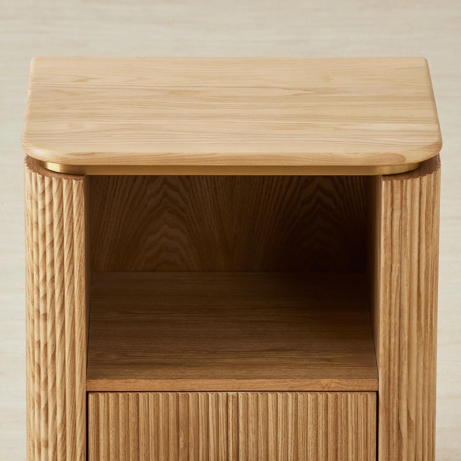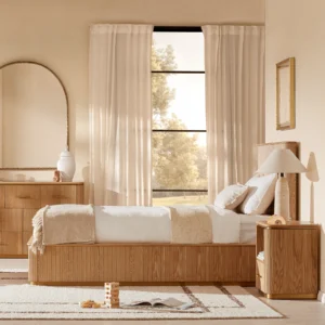 There’s a quiet charm to the San Pierre Kids Bedside Table. A place for bedtime stories, nightlights, and the little things that help wind down the day. Its rounded top, light brown ash finish, and gently fluted sides bring a warm, textured feel to any child’s room.