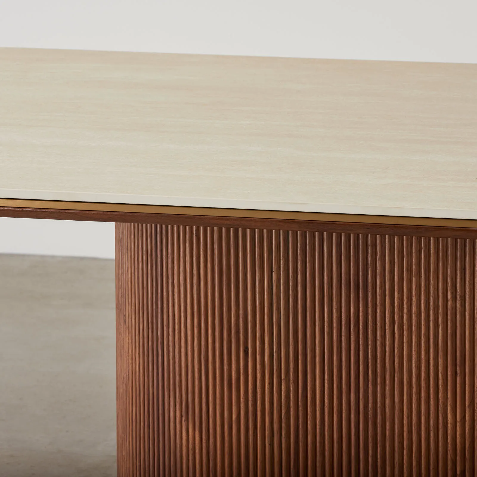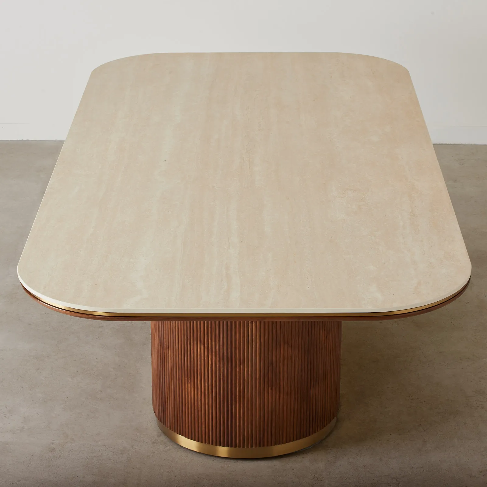 The San Pierre Dining Table stands as a testament to grandeur and sophistication, crowned with a majestic travertine finish sintered stone top. This exquisite surface, renowned for its timeless beauty, transforms everyday dining.