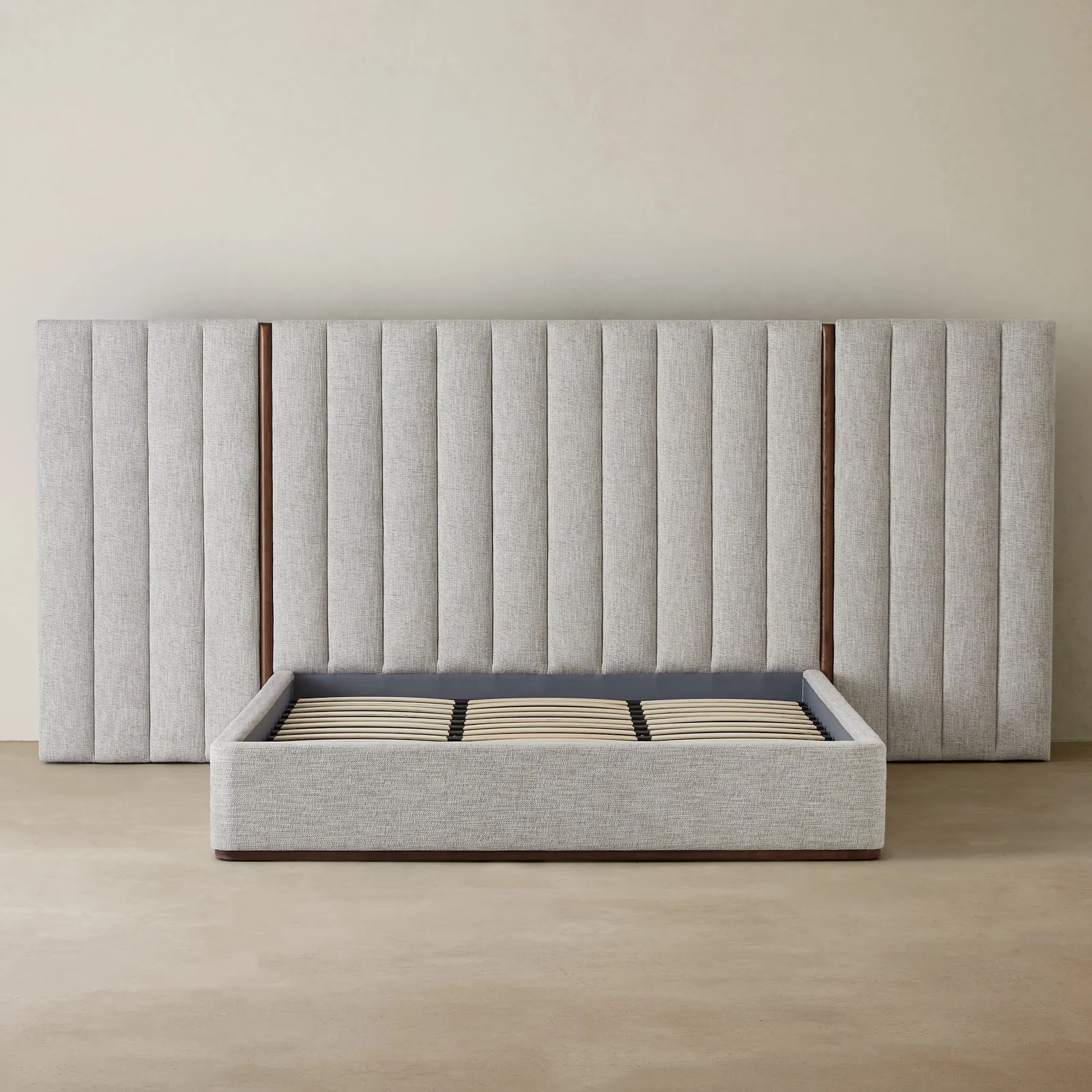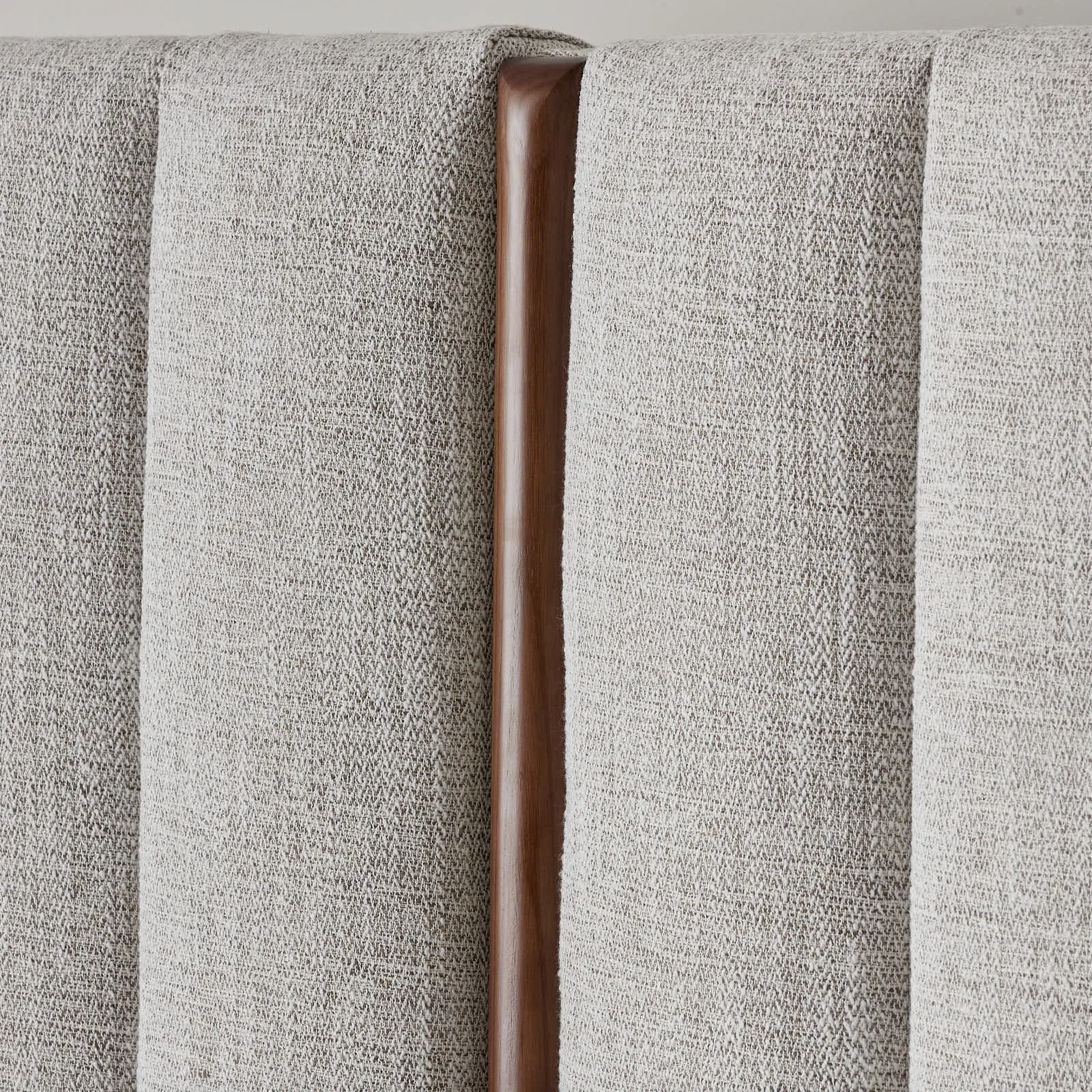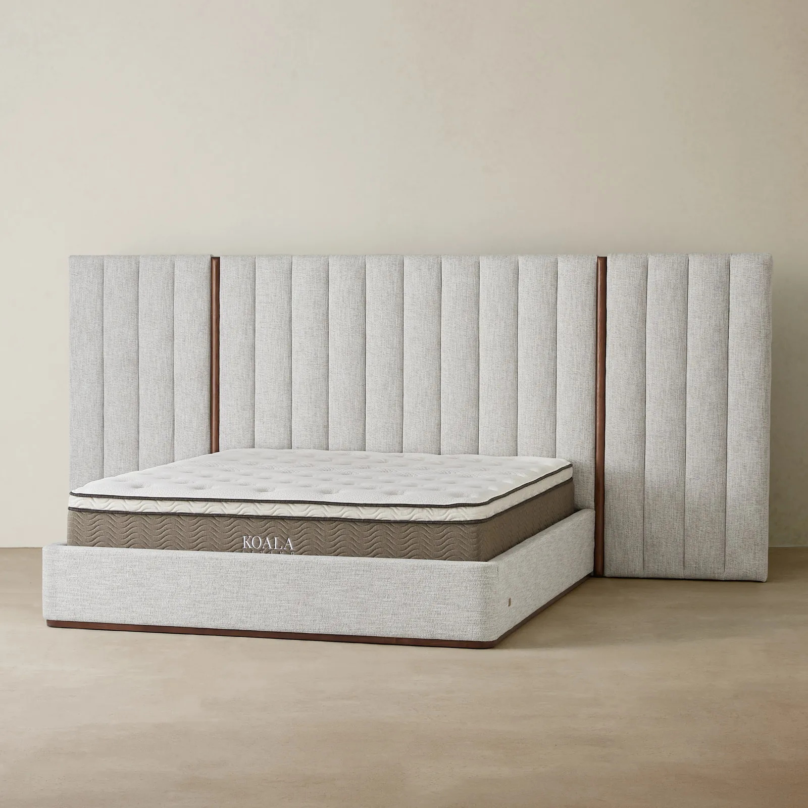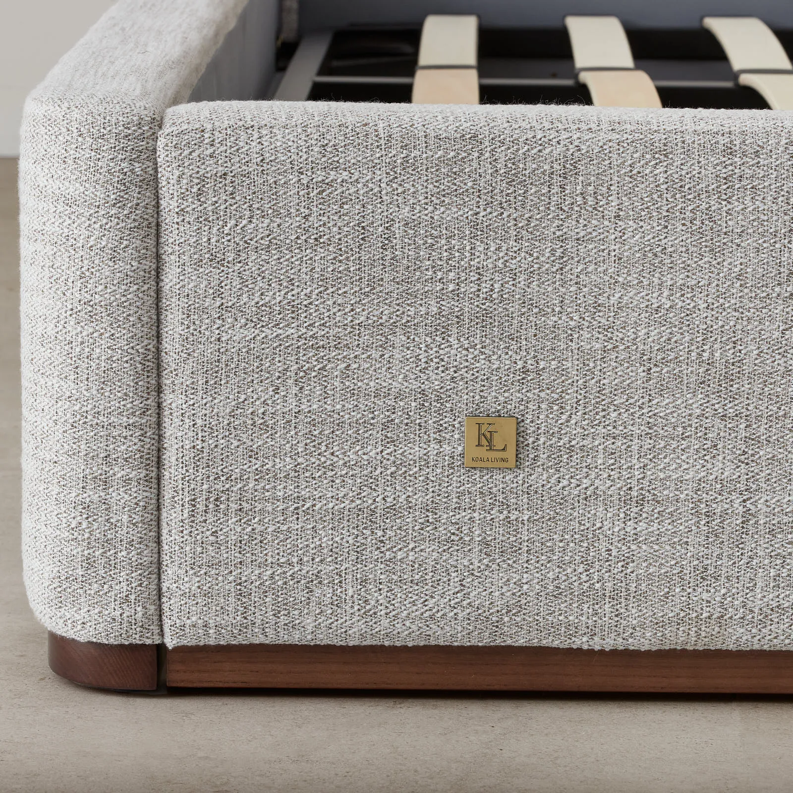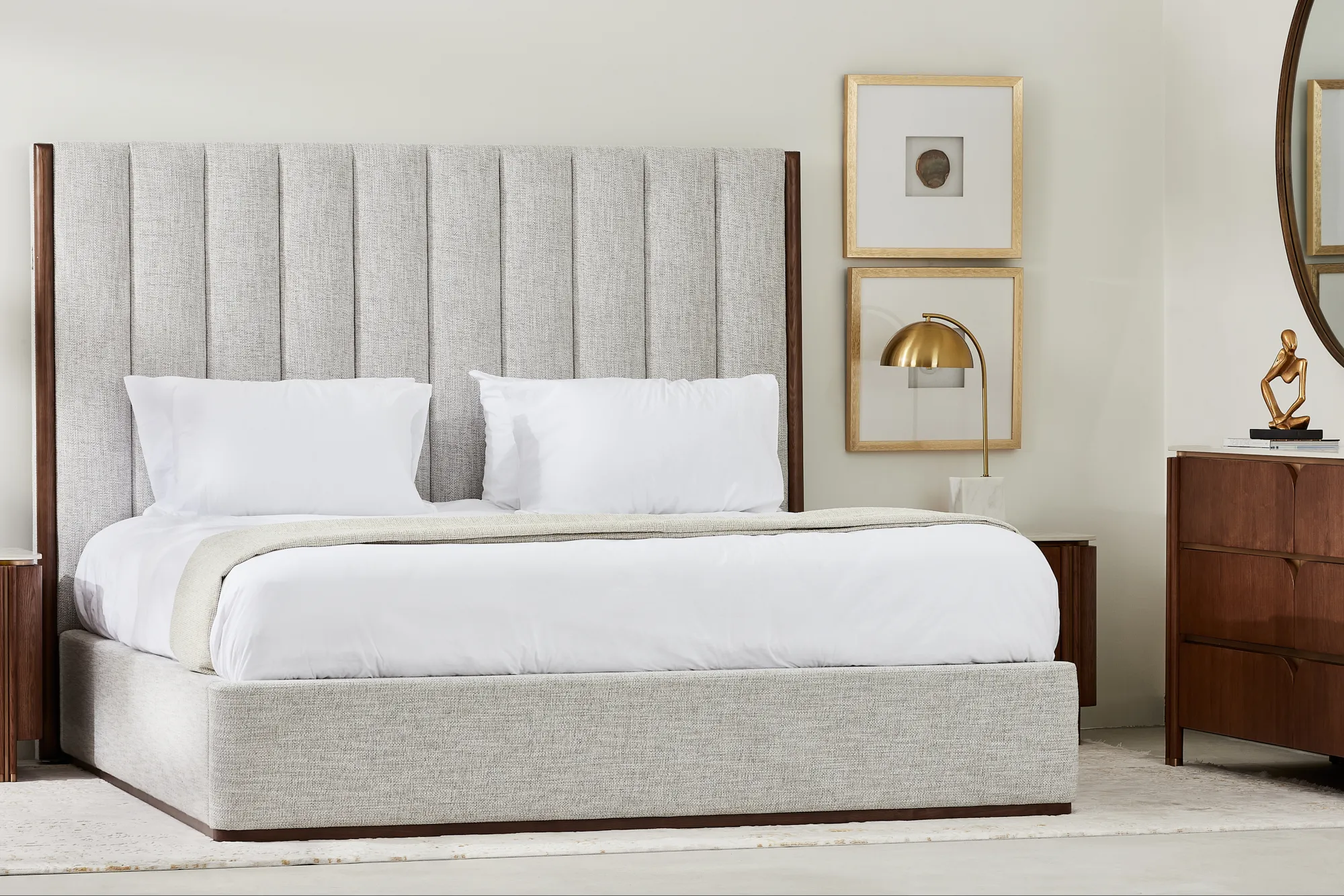 Draped in Murmur White woven fabric, it offers a soft, inviting texture. This combination gives the bed a modern aesthetic for contemporary bedrooms.